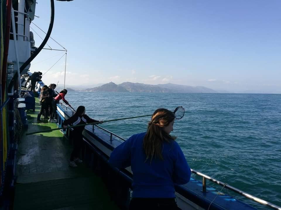 Mientras, siento el sabor del salitre según sale el Mater por la bocana de Pasaia, disfrutando una vez más de las vistas a esa gran pared lisa del Faro de la Plata y a los primeros acantilados de Jaizkibel. Ya en mar abierto empiezan las órdenes, que acata a su manera la chavalería: «¡A las cuatro a estribor! ¡Vamos, vamos!». Y con rapidez se apresuran los niños a recoger un enorme plástico. «¡A las tres a babor otro plástico!». El mismo Asier, un avispado chaval de unos quince años, es quien desde el puesto de mando atisba cada residuo de latas, papeles, redes: «¡Vamos, vamos, coged el salabardo, pero YA, espabilad, mirad cuánta basura!».
