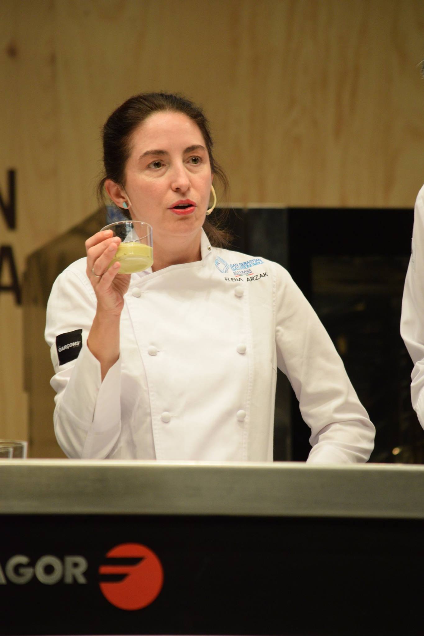 Pero de celebraciones no solo vive Gastronomika, que ha contado en su primera jornada con un total de 14 ponencias magistrales. Carme Ruscalleda(Sant Pau***, Sant Pol de Mar) las ha iniciado con un alegato en femenino: “Las mujeres no queremos competencia, queremos el mismo foco”. Tras la proclama, la chef que en breve cerrará su casa madre ha presentado a dos mujeres para tomar la palabra. Primero, su pupila Sue Chávez, mano derecha de la chef ahora en Cuina Estudi, y a la periodista Rosa Rivas, que ha escrito el nuevo libro de la chef: “Felicidad”. “Carme lleva 30 años haciendo feliz a la gente, y lo seguirá haciendo”, comentaba Rivas. Ha cogido el testigo a la catalana Diego Guerrero (DSTaGE**, Madrid), con una masterclass de técnica y respeto al producto, incidiendo en su voluntad de trabajar cada vez con menos ingredientes, “pero con mucho trabajo detrás”.