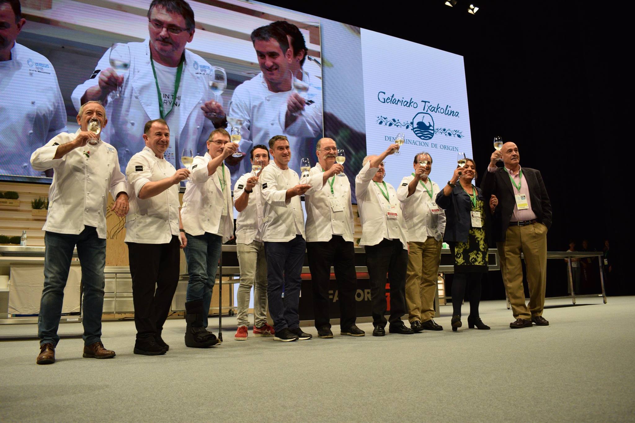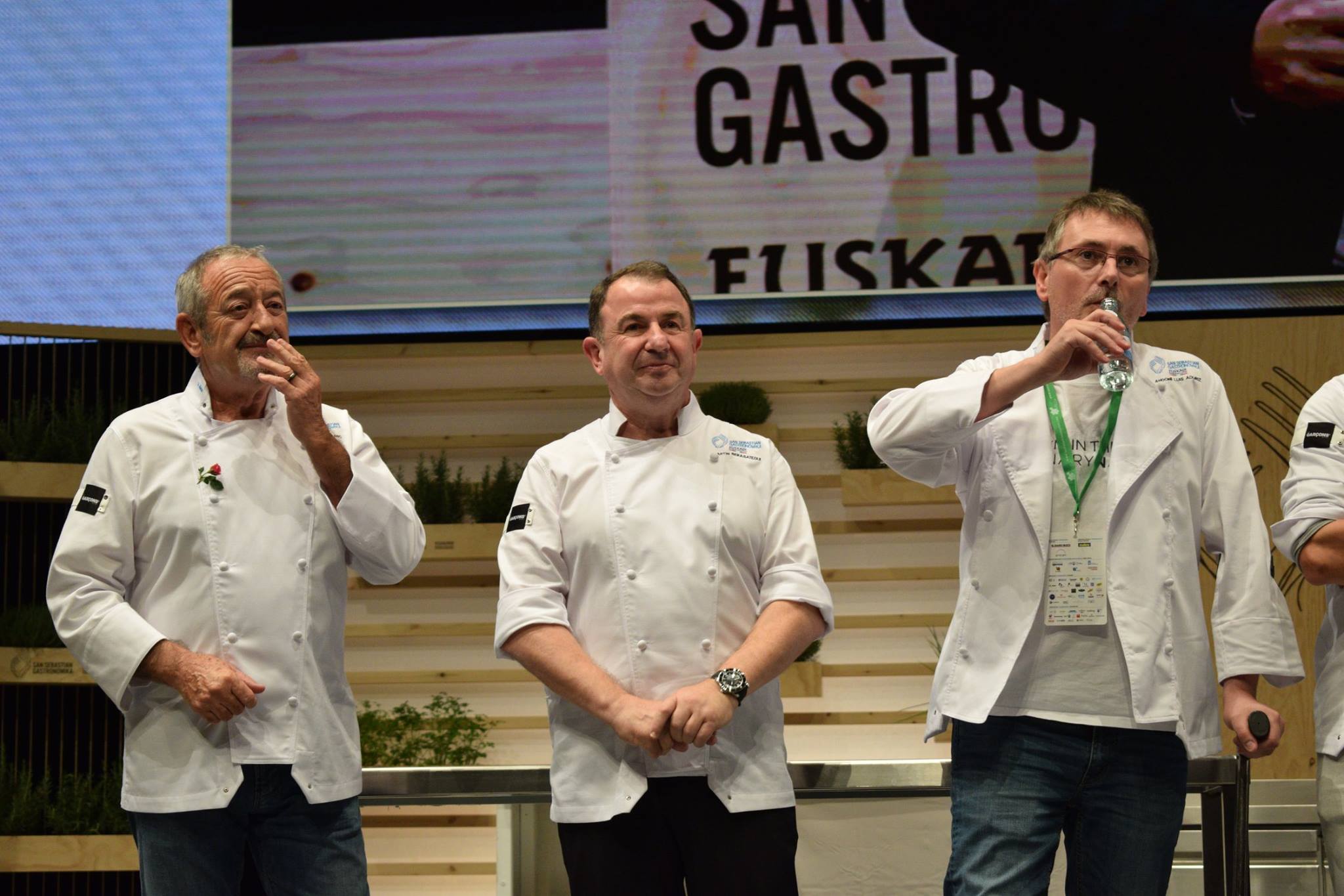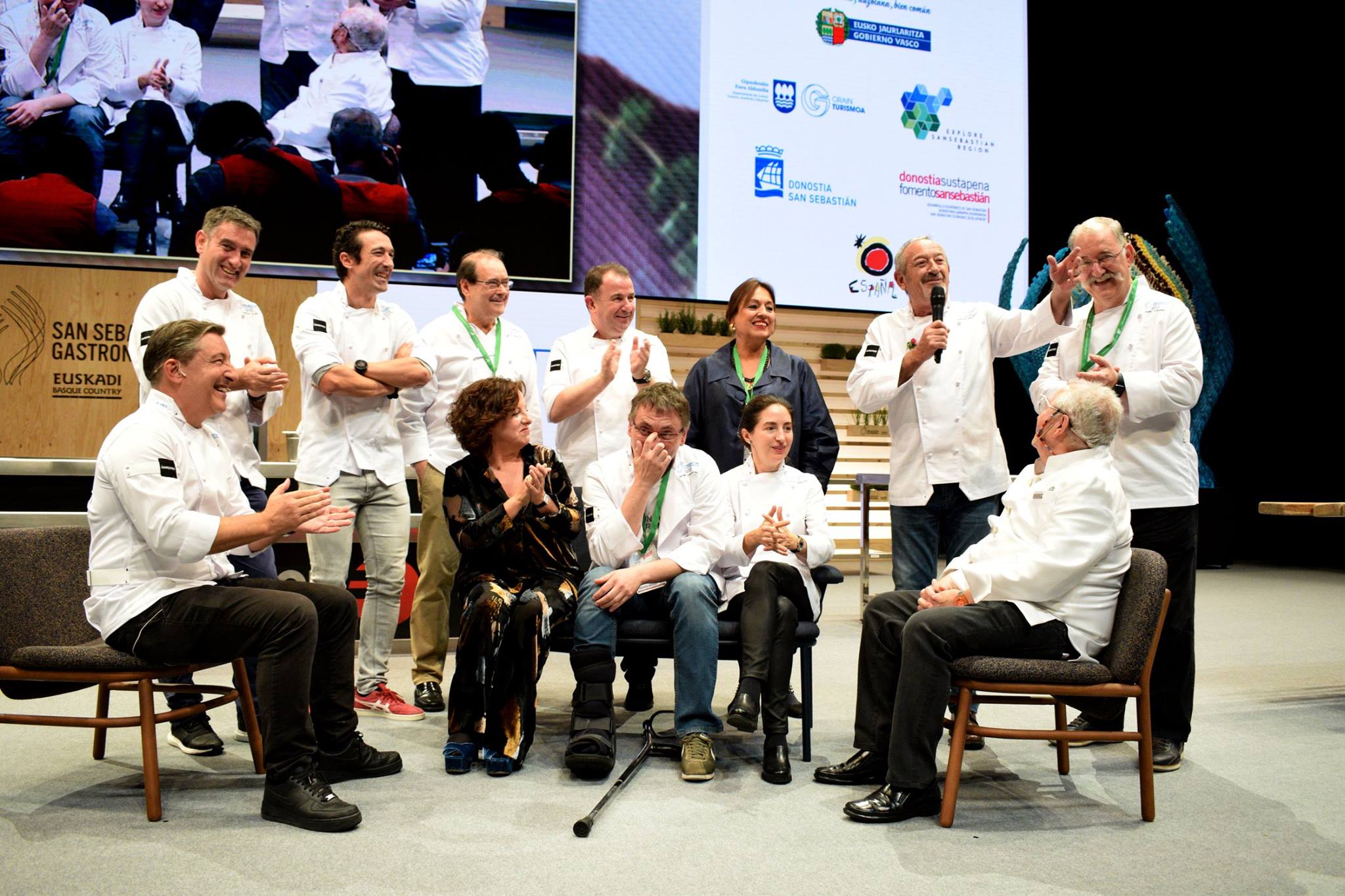 Su compañero y amigo Ramón Roteta le ha hecho entrega del trofeo y todos sus amigos –chefs, colaboradores, personal del restaurante…- han subido al escenario para acompañarle. En concreto, Joan Roca (El Celler de Can Roca***, Girona) ha loado su figura recordando lo importante que ha sido y es para él: “Cuando te conocí y comí en tu casa, hace muchos años, me dije: Yo quiero ser como Arzak. Y lo he intentado…”. Semejantes palabras de agradecimiento y gratitud se han oído también en el vídeo que el congreso ha preparado para la ocasión. Entre otros, Michael Bras, Mauro Colagreco, Ferran Adrià, Daniel Humm, Ana Ros, Alex Atala, Mitsuharo Tsumura, Pierre Gagnaire, Hiroyoshi Ishida o Tomas Keller hablaban del galardonado finalizando la intervención con un “Aupa, Juan Mari”. El aplauso más grande del mundo. “Me he emocionado de verdad”, reconocía el chef. Gratitud eterna.