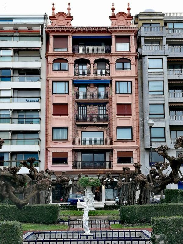 Llama la atención en la Calle Hernani y junto a los jardines de Alderdi Eder este edificio de color salmón claro que casi no veremos por la ciudad. Lo destacamos porque además de las vistas sobre La Concha, en los atardeceres de casi todo el año brilla de forma especial tanto su fachada como los mosaicos que adornan sus balcones. Un efecto muy bonito.