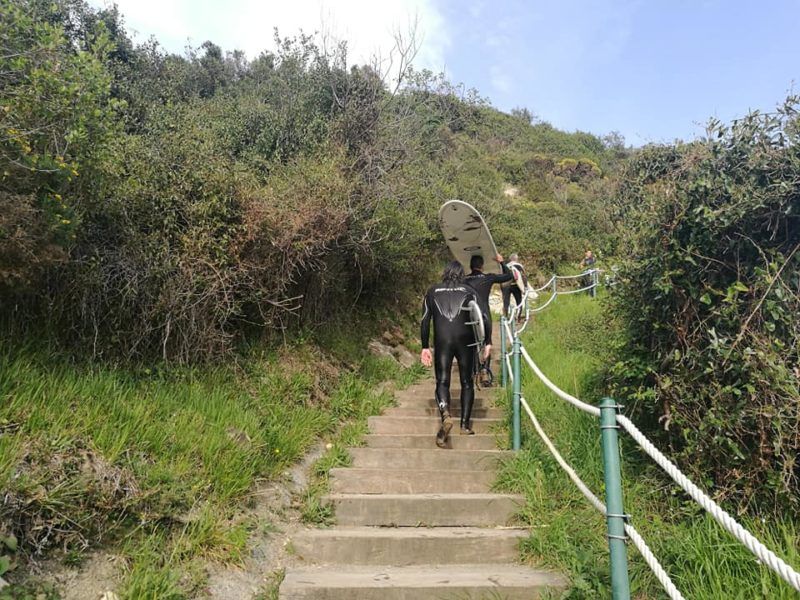 - Enseguida tomo la escalinata de madera que lleva hasta Zarautz con impresionantes vistas del Cantábrico y la silueta cercana del ratón de Getaria. Más de 400 escaleras donde suben y bajan a diarios surfistas de las aguas zarauztarras.