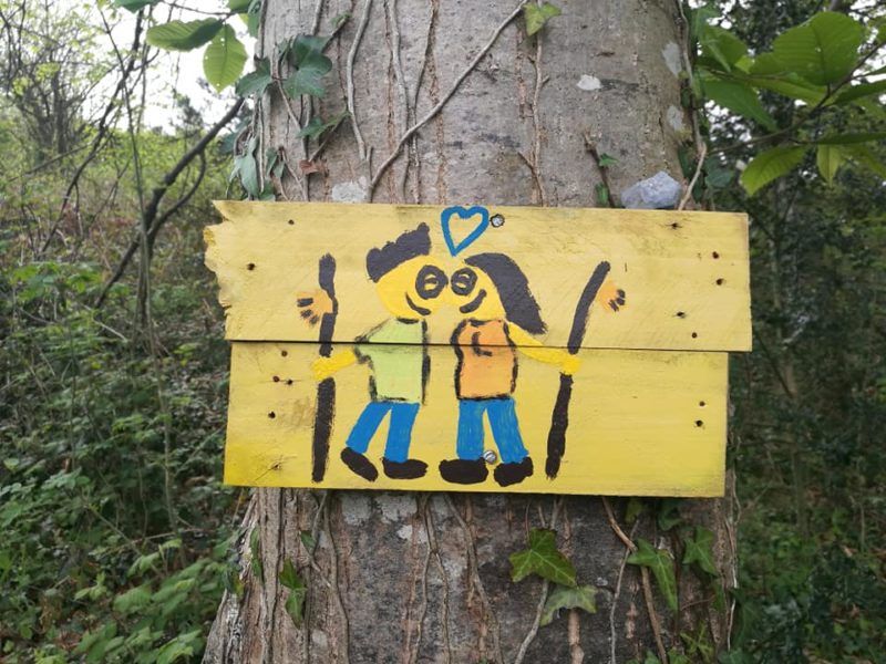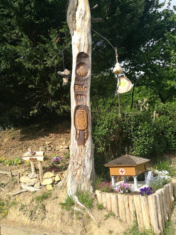 - Enseguida entramos en un pequeño bosque donde veremos una » exposición » de dibujos dedicados al peregrino, a los excursionistas enamorados, a los que vienen en sus bicicletas…