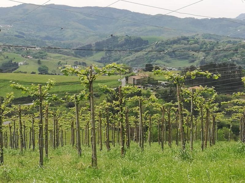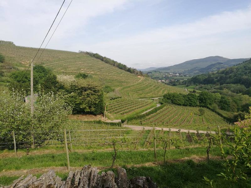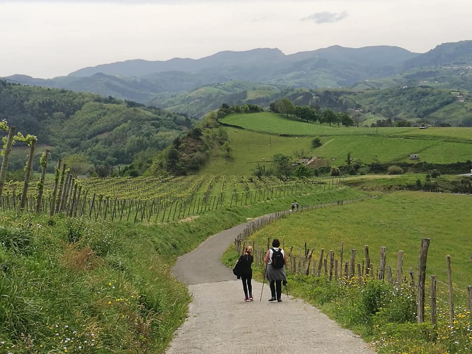 - Ya arriba del camino y antes de subir un poco más hasta el camping disfrutaré de las vistas de estos terrenos donde cultivan las bodegas afamadas Talai Berri, Erdikoa, Esparru, Urkieta, Talaipe, Muñagorri, Eiko Gaina, Jakue, Altzondo, Mahats Berri, Soraluze, Montteburu o Lurberri. Ya en el camping tomo el camino que me lleva hasta Zarautz.