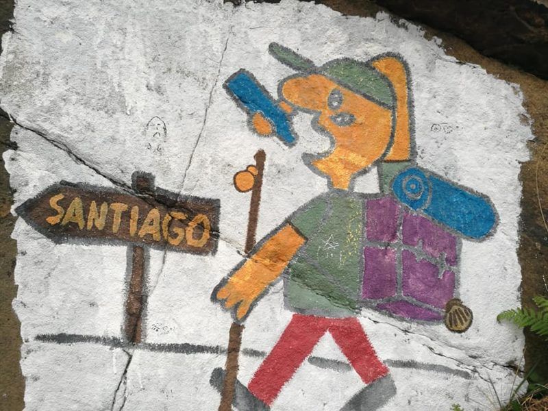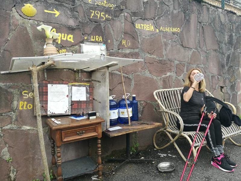 - Un fotógénico rincón peregrino nos llama la atención y sirvió de parada para beber un poco de agua tras casi ya una hora de paseo. Hasta había sello y reglas del peregrino. 795 kilómetros todavía hasta Santiago de Compostela que hubiéramos hecho con alegría de tener que volver a casa para pasar este reportaje.