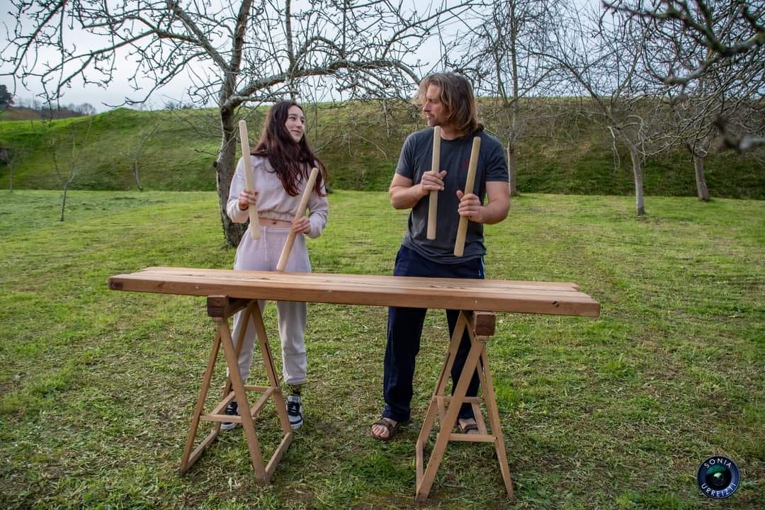 En las campas de Urnieta, entre los manzanales de Setien Sagardotegia, aprendimos historia y sonidos de la txalaparta. Con Felipe Ugarte, de Ugarte Anaiak, acompañado de su hija Nahia con quien forma el dúo UgarteKun.