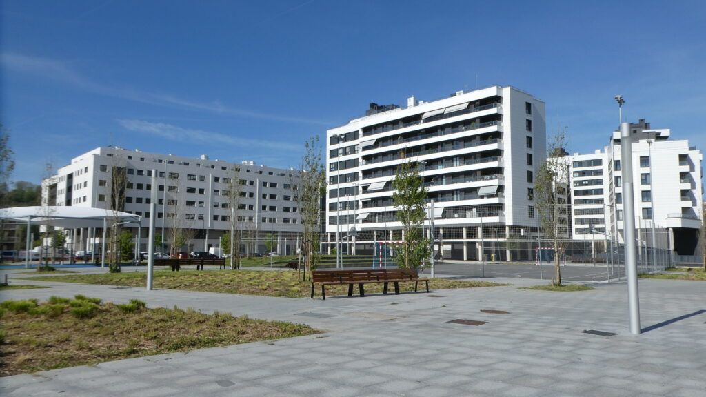 Varias avenidas dan paso al interior del barrio de siete manzanas con punto culminante en la gran plaza de Arteleku con construcciones de viviendas de diseño y uniforme arquitectónico con todas las infraestructuras necesarias para vivir en comunión con la naturaleza de un parque fluvial de diseño, que se cruza por un carril bici y un paseo peatonal que va paralelo al río .