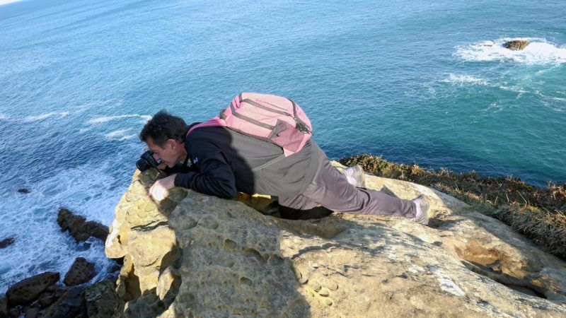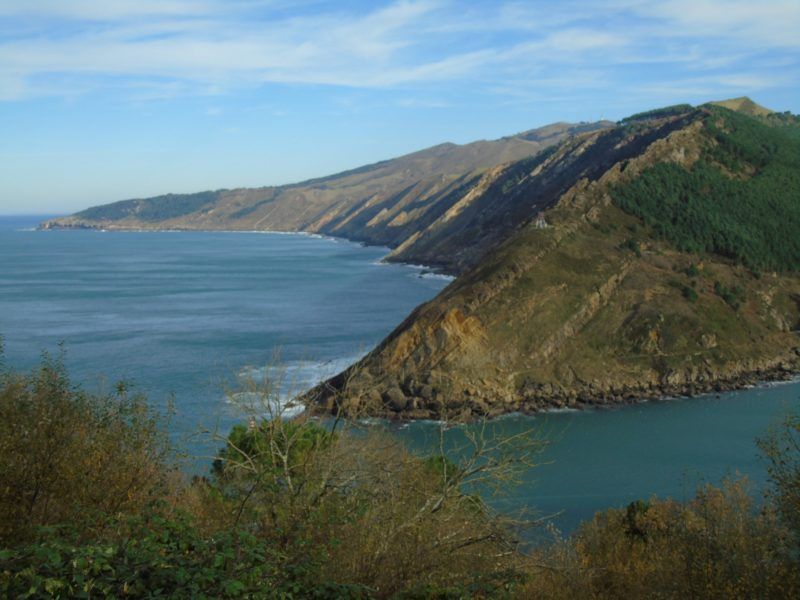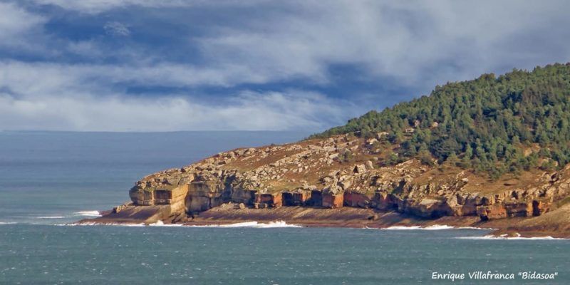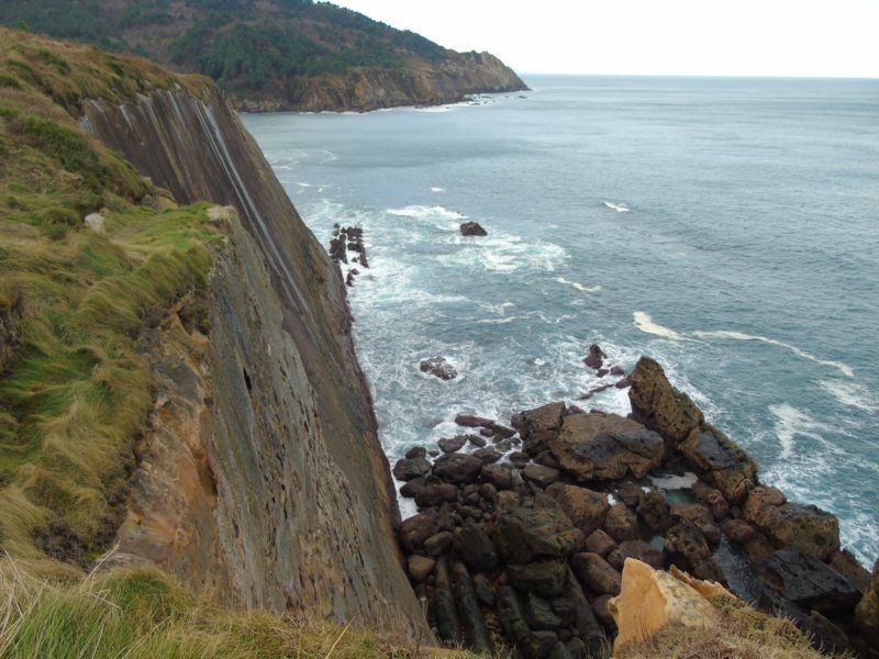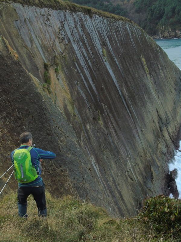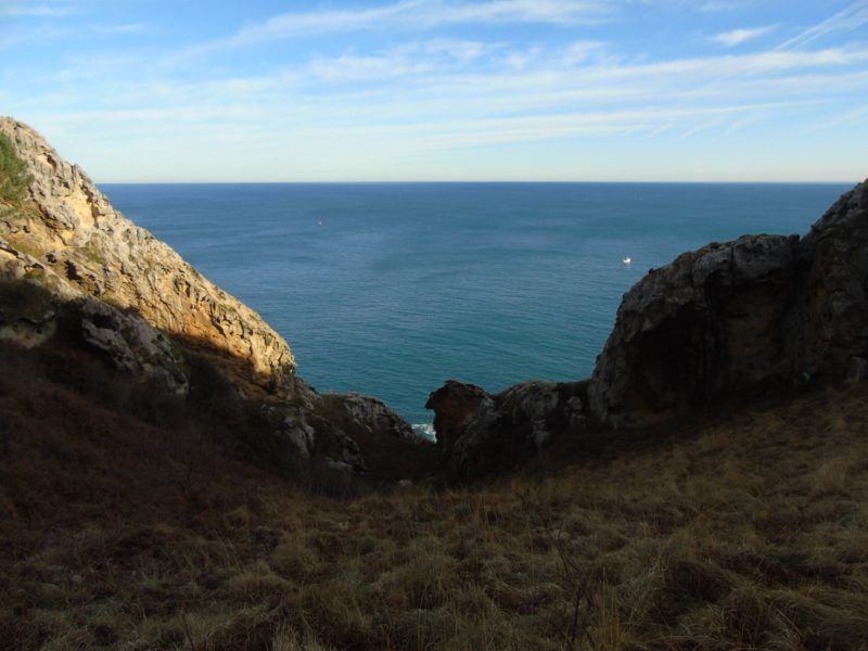 Buscamos el camino ya » orinoco-amazónico» por momentos difícil, oculto y en tramos de cuerda hasta alcanzar la Cala Ilurgita o de Mendiola, muy popular donde en mareas bajas pueden verse bolas redondas coloreadas que ya merecieron otro artículo cuyo enlace os dejamos aquí. Mientras tanto las vistas de los acantilados del Faro de la Plata son inmejorables, buen presagio de lo que se avecina.