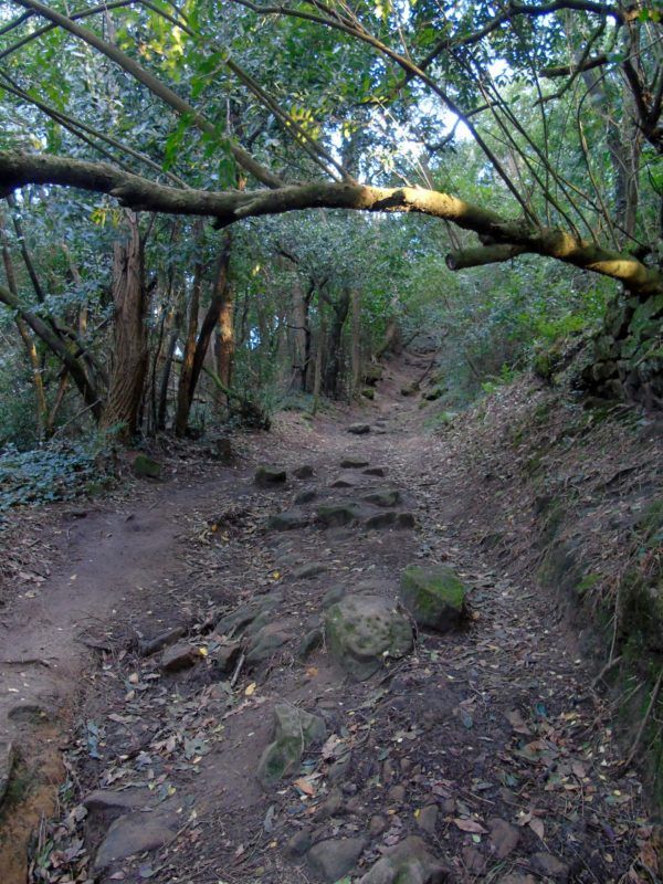 Tras llegar a un panel informativo en un cruce de caminos tomamos hacia abajo la senda que nos lleva por un puentecito de madera a un nuevo cruce. Por la derecha veremos una cuesta a modo de bóveda natural formada por los árboles y por ahí seguimos…