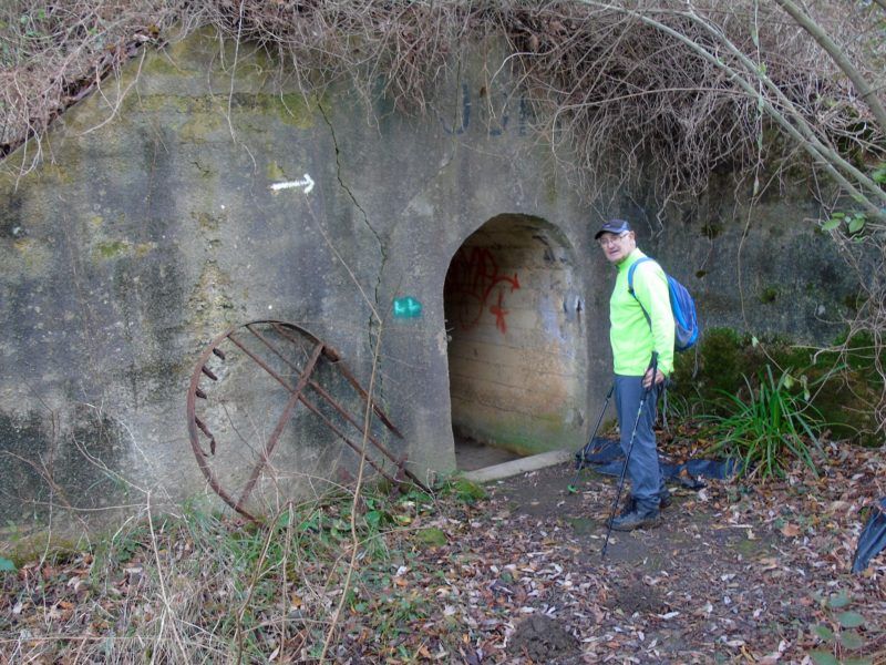 Seguimos por la sendas más cercanas al mar olvidando subir hasta la habitual senda de las ikastolas y tras las vistas aéreas de la citada cala que vemos en la foto de arriba, encontramos un túnel de 200 metros, restos de la conducción de aguas que desde Ulía llegaban a la Casa de la moneda de Bidebieta. Con agua hasta el tobillo hubo que cruzarlo sin problema alguno aunque hubo quien no llegó a mojarse las zapatillas de monte…