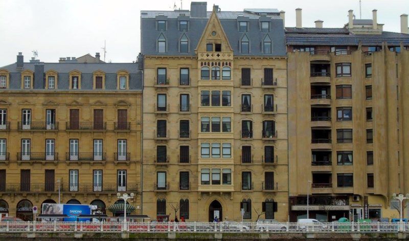 Pero su comienzo es el Paseo de Salamanca, fuera de la muralla, importante arteria del ensanche oriental. Hay que caminar al borde de la desembocadura del rio y del mar Cantábrico como telón de fondo, contemplando los edificios de viviendas, destacando los nºs 2 y 7. El primero, reconstruido a causa de un incendio aún mantiene su carácter neogótico en su fachada, (proyectado por José Vicente Mendía 1892), aunque la construcción del catalogado mirador es de Luis Elizalde (1914). Nos acercamos al 2º edificio citado, y si hay suerte observar su fastuoso pórtico octogonal de estilo neogótico sería un espectáculo impagable, tiene un significado remate almenado en el chaflán de la esquina (José Majó y Xibert 1895).