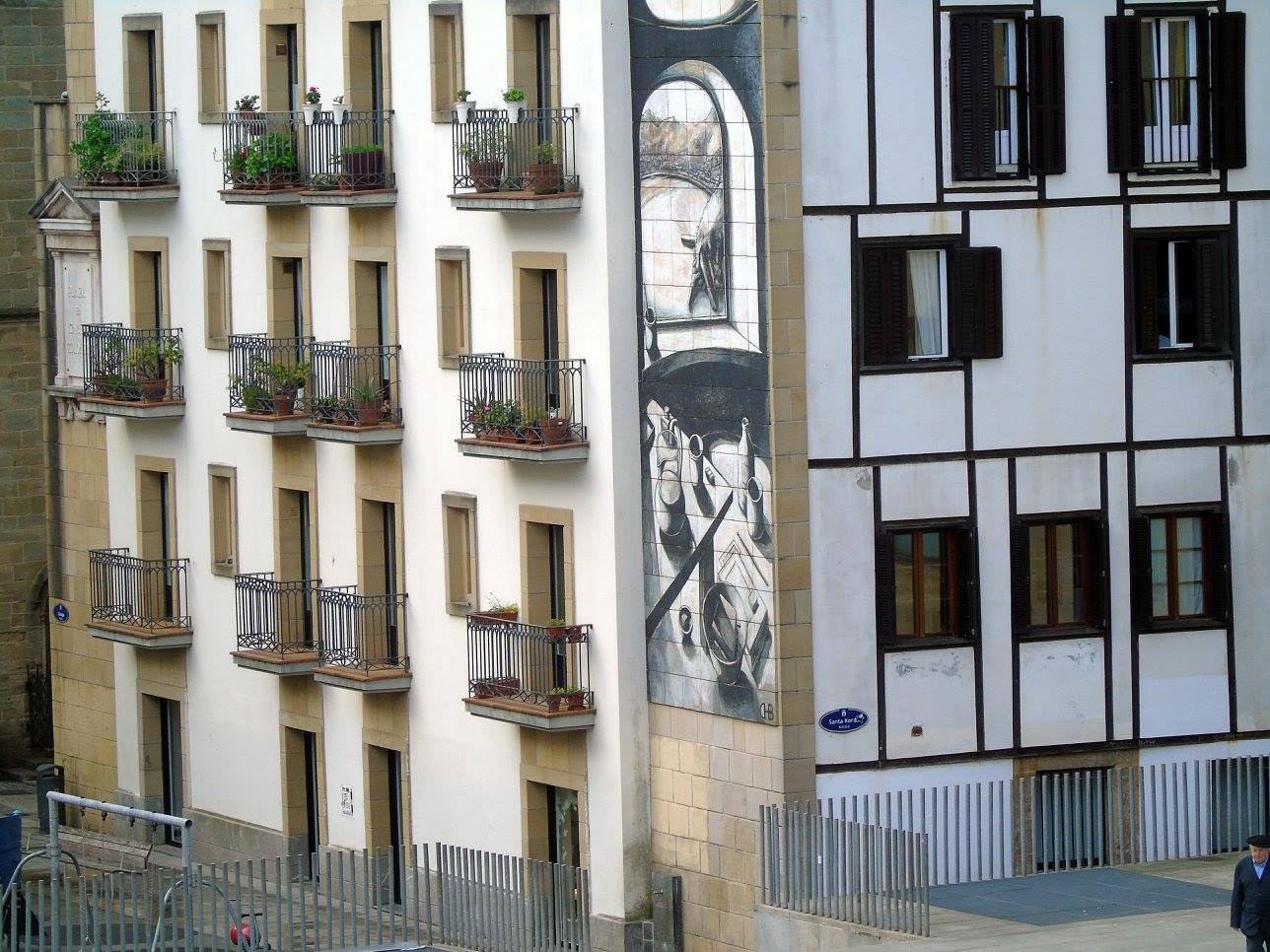 Penetramos en el interior de la antigua ciudad por un galante edificio, en la calle San Juan 27, (antigua casa de baños desde el año 1922 y actualmente sede de la Sdad Fotográfica de Gipuzkoa) , de arenisca, con mansarda y escudos de la ciudad en su fachada, para seguir por la gran plaza de Zuloaga ( Fray Martin de Santiago (1542) y allí se sitúa en un antiguo Monasterio de los Dominicos asentados en 1539, y hoy Museo emblema de la ciudad, San Telmo, un destacado conjunto con fachada plateresca, que merece visitarse con tiempo. Y cerrando este espacio duro, tenemos el catalogado y protegido edificio de los cines Príncipe, San Juan 8 bis y Aldamar, (Ramón Gortázar 1930) para intimar con él y la Iglesia de San Vicente.