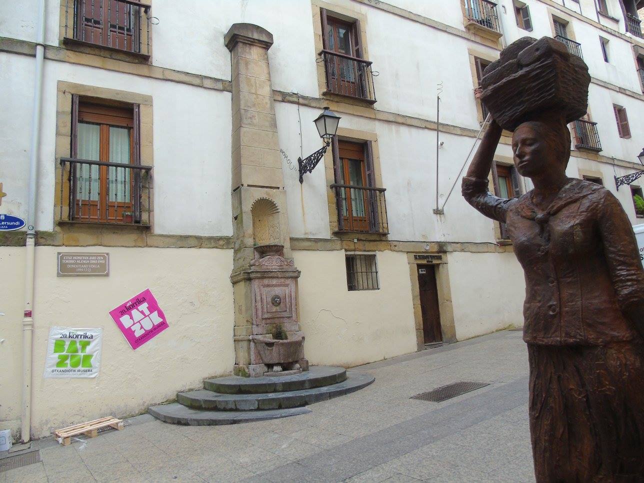 Pero antes, en el vagabundear por esta histórica vía de referencia en la ciudad que nadie deja de contemplar, nos encontramos con el corredor de “Valle Lersundi” donde se encuentra la sociedad Kanoietan con la escultura de Dora Salazar “homenaje a la mujer reconstruyendo la ciudad” y unos metros después a la dcha se encuentra uno con otro icono imprescindible, la plaza de la Trinidad, (Luis Peña Ganchegui 1963), construida coincidiendo con el centenario del derribo de las murallas. Una sólida construcción apoyada en los edificios contiguos, y punto esencial para diferentes eventos de todo tipo, deportivos y culturales. y porqué no visitar por calle San Jerónimo, la escondida Plaza de la Constitución (Pedro Manuel de Ugartemendia 1815, Silvestre Pérez 1819), en otro encuentro de tronío. Un conjunto histórico que no tiene desperdicio con imagen austera de estilo neoclásico relacionada con la homogeneidad de los edificios de la parte vieja.