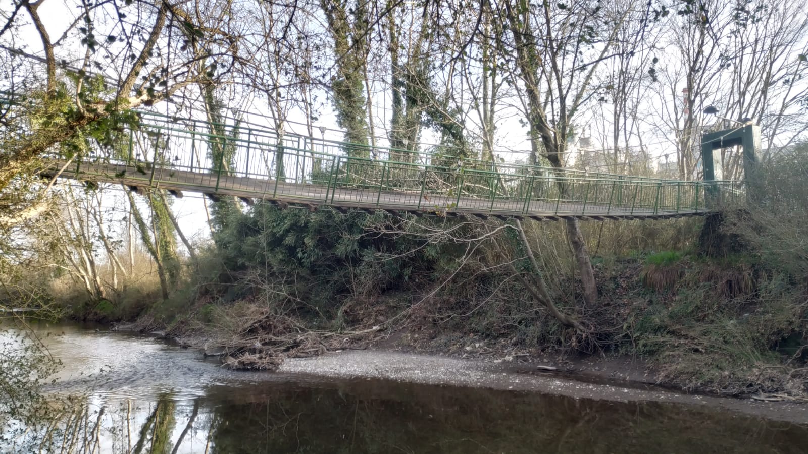 Puente pasarela colgante rústica con tablones de madera y atractiva, de los muchos que existían para atravesar el cauce. Actualmente está tan deteriorado (como otros muchos) que su paso está cerrado. Bajo el puente se sitúan los restos de un popular lavadero, punto de encuentro de la sociedad hasta mediados del el siglo pasado.