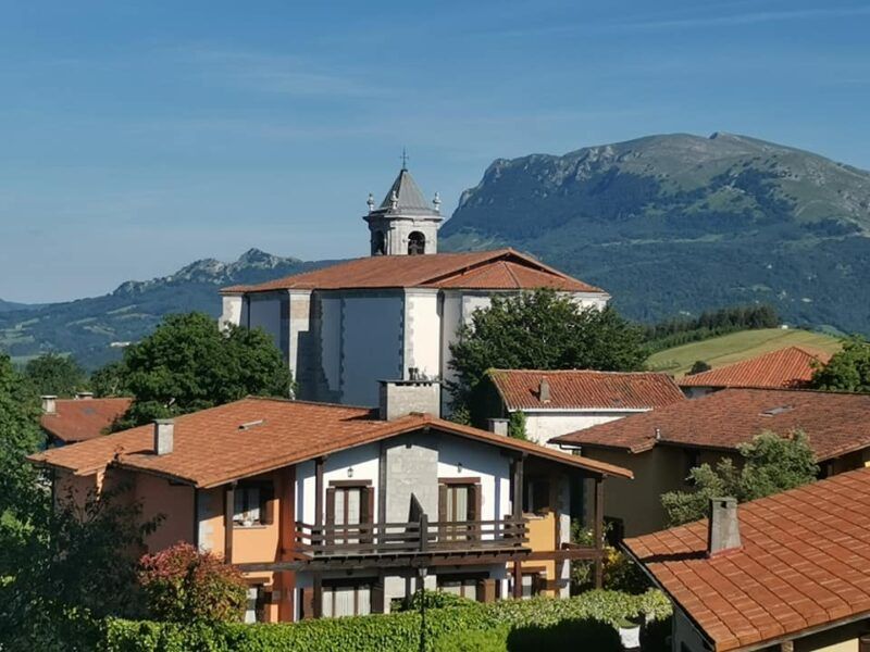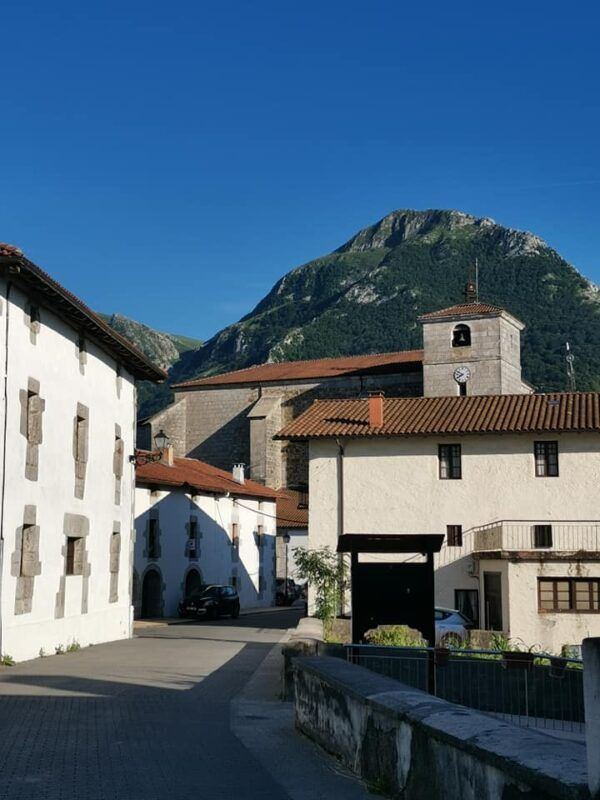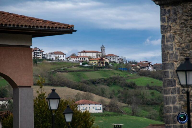Sigo ahora la carretera y en 350 metros llego a este idílico pueblo, de grandes vistas a la Sierra de Aralar, dominado por la Iglesia de la Asunción donde en 1904 ingresara Joxemiel de Barandiaran para estudiar la carrera de sacerdocio. Disfruto del pueblo, sus dos frontones (uno diminuto), las cuidadas casas con jardines y flores, y las vistas hacia Orendain, pueblo que veremos a la tarde.