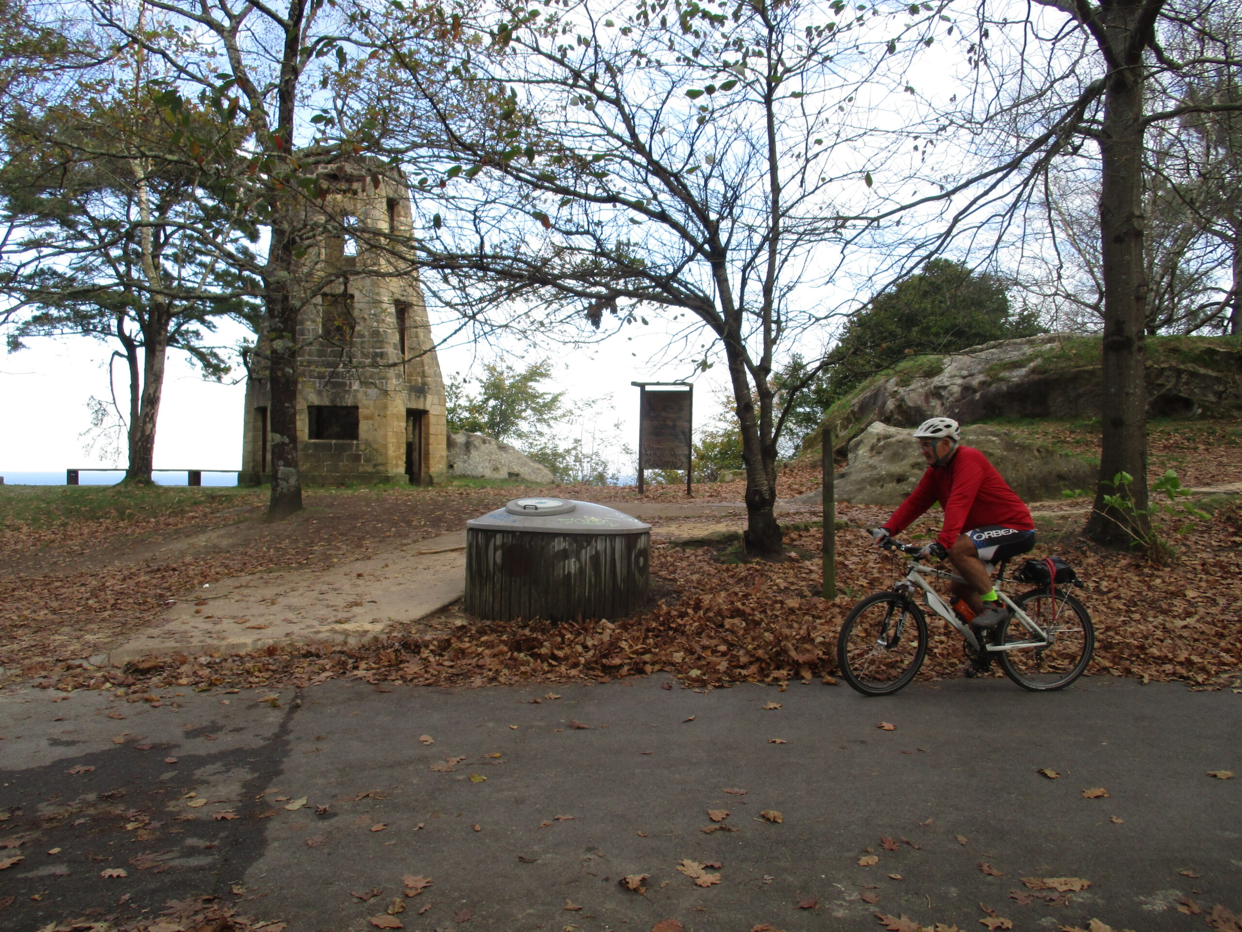 La ascensión pedaleando es muy gratificante. Discurre en un escenario boscoso por la vertiente sur del monte, con un promedio al 4% y solo tiene un tramo en la herradura del “palacio Garay enea” que sube al 7,2%, donde la vía cambia de dirección. Al llegar a la rotonda aparcamiento recordamos, en otra vuelta de tuerca, al tranvía y al teleférico.