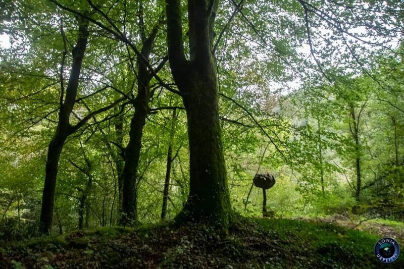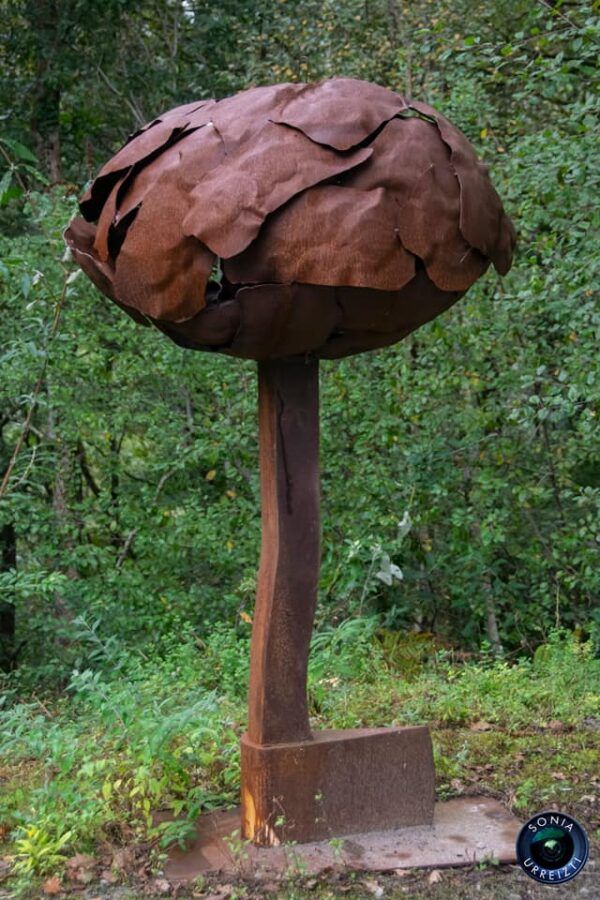El escultor Koldo Jaúregi, director artístico de la película Dantza, ha diseñado en los terrenos de su caserío un privilegiado espacio natural donde arte y naturaleza se conjuga a través de un circuito sobre el campo y el bosque que nos cautivó.