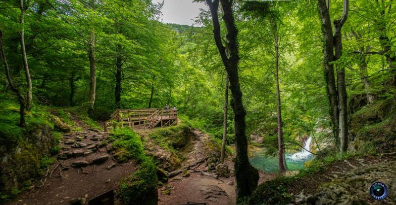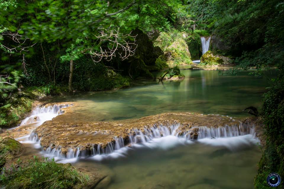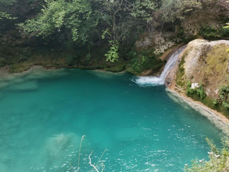De las mismas entrañas de la sierra brota este río, formando pozas, pequeños saltos, con aguas turquesas que según la luz se convierten en fantasía pura. Todo el recorrido es en realidad fantasía, a la sombra de grandes árboles que también guardan espacios de cuentos de hadas. Solo faltaron los gnomos o las lamias. ¿O quizás las vimos?