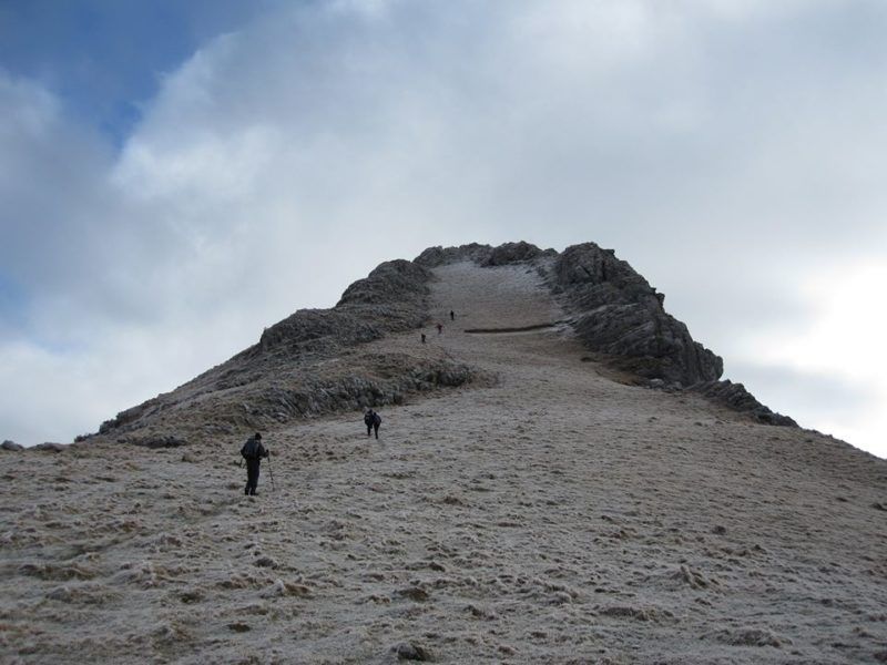Sin embargo la ruta mas cotizada es la directa de la arista NW, una ascensión con carácter. Nos enfrentamos a una vertiente muy inclinada de hierba, un “muro” por donde no discurre camino alguno en su primera parte, y sin descanso hasta la cima. Son 1000 metros de desnivel en dura pendiente. Si en cada paso se salva un metro de altura, se gana altura rápida y sorprendentemente . Es necesario echar la vista atrás para disfrutar del recorrido y del valle desde donde hemos partido.