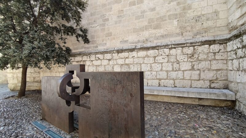 En el lateral de la calle Cadenas veré una escultura de Eduardo Chillida, “Lo profundo es el aire”. Curiosamente Chillida, que fue portero de la Real Sociedad antes que escultor, se retiró del fútbol tras una lesión en el campo del Valladolid.