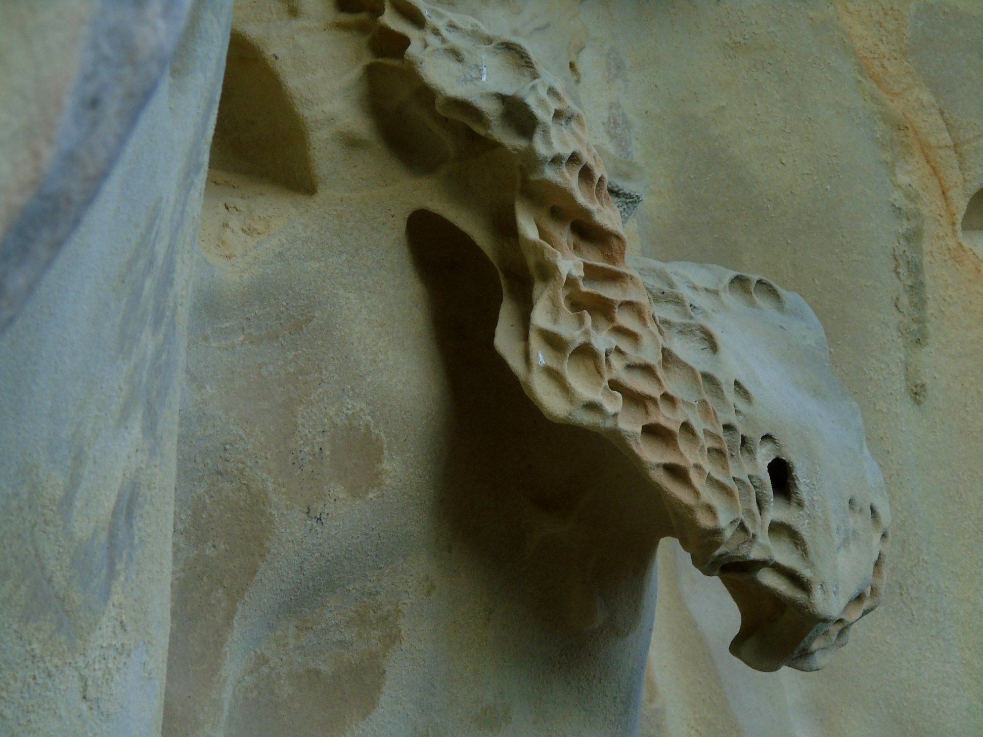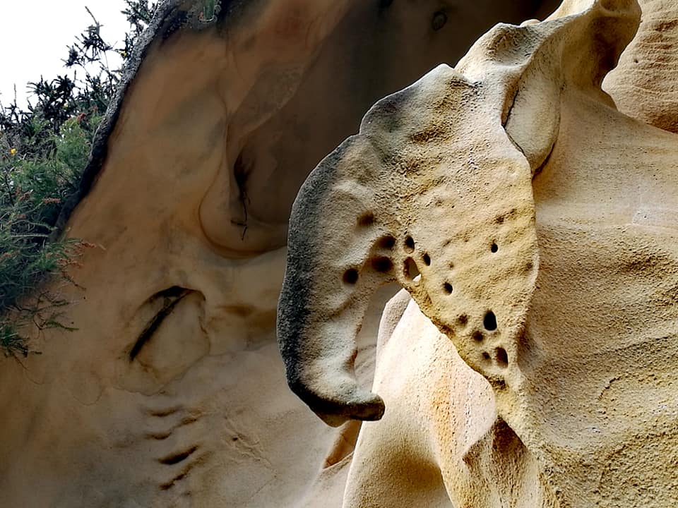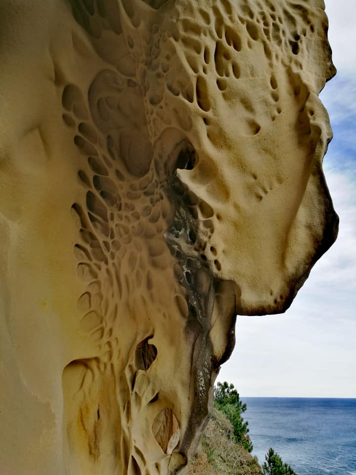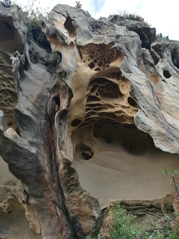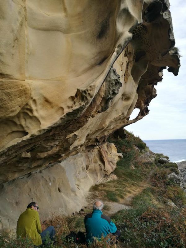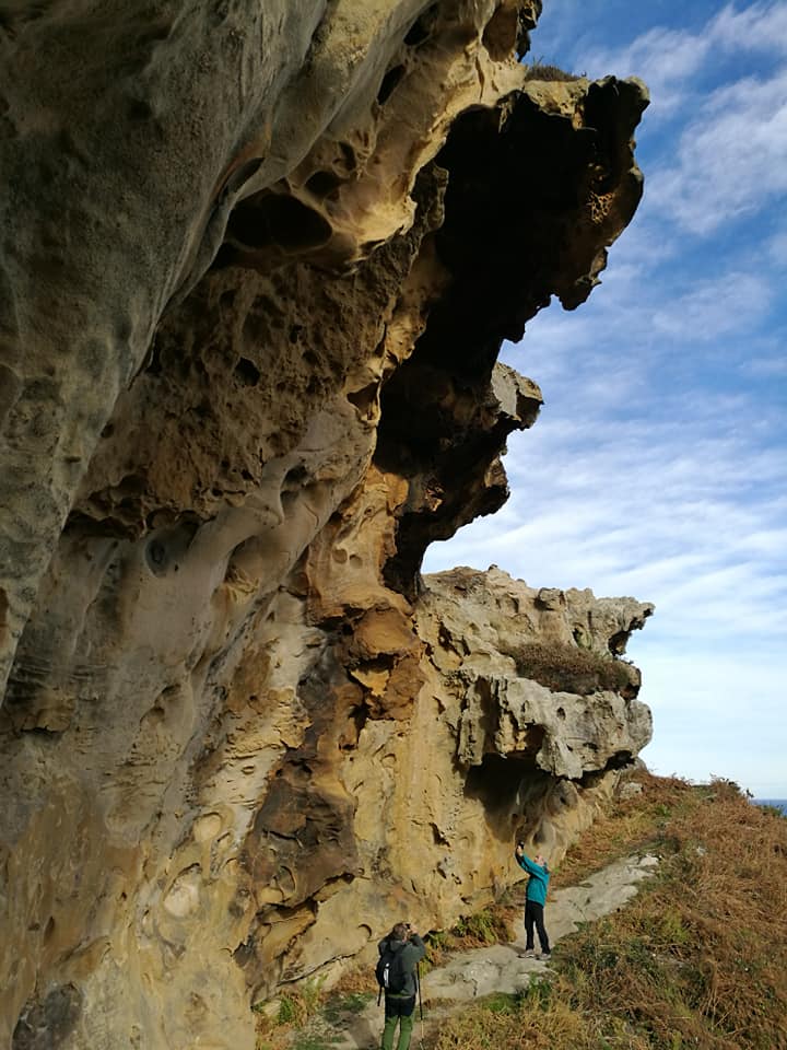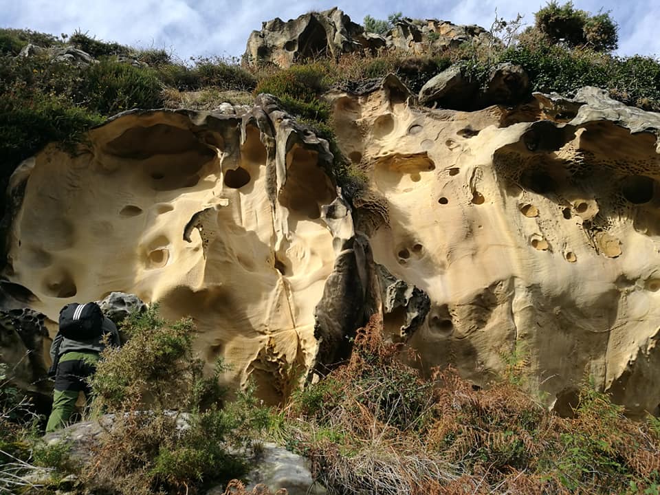 Quinta excursión de Donosti City con nuestros sherpas de Jaizkibel. Tras Gran Kanto, La Catedral, las paramoudras y el Laberinto Blanco, nos siguen llegando nuevas sorpresas y hoy ha sido el turno para el Valle de Erentzin donde de nuevo la naturaleza juega a modelar mil y una formas de variados colores. Una gran pared llena de cavidades que desde lejos no aparentan lo que después ofrece de cerca.