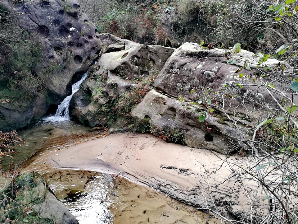 Enseguida la cornisa superior del Valle de Erentzin, un queso gruyere cubierto de vegetación que deja al descubierto cuevas de mil formas y colores que a su vez esconden figuras como la trompa del elefante, la brujita, el extraterrestre… cualquier cosa vale, así que lo mejor será mirar las fotografías y los vídeos. Resulta curioso ver cómo la erosión de estas areniscas llegan a formar pequeñas playas como la que ya tras el descenso formaba el riachuelo de Erentzin.