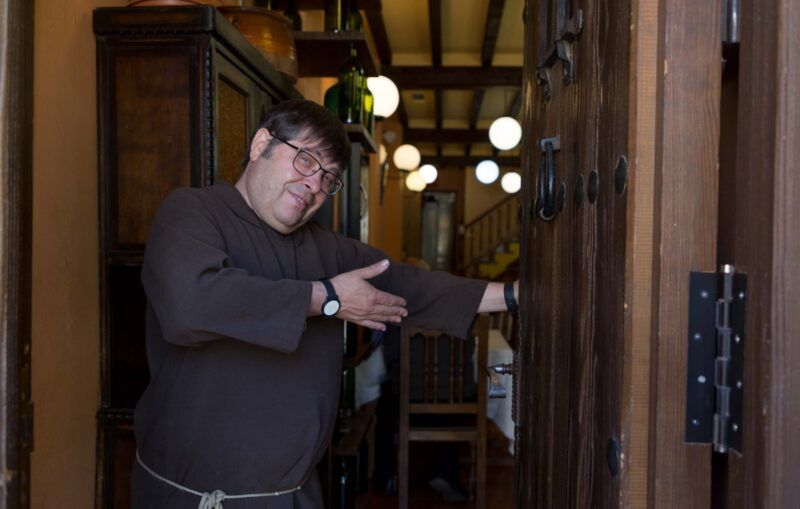 Allí estaba Javier Romero, el propietario del imperio del cocido, Venta de Corpes, vestido de abad, medallón colgado del cuello, pues como reza su tarjeta de visita es… “salvador de almas”. Agradable fue su acogida, amabilidad y predisposición para las fotografías de Pablo, vídeos, podcasts y demás reportajes para nuestro YouTube. Disfrutamos en la cocina, entre los fogones, donde Pilar daba vueltas y vueltas a las sopas y caldos cuyos aromas ya desataban los nervios estomacales con tanta furia que casi no fue necesaria una vueltecita previa por este tranquilo pueblo que domina desde una breve colinita, un castillo templario en ruinas.